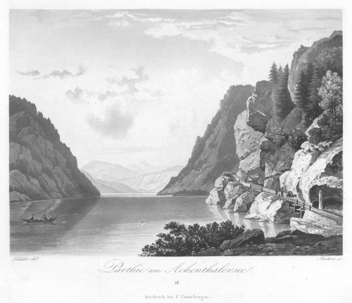 ACHENSEE. - See mit Ruderboot, von Bergen umgeben. Rechts in Felsen gehauener Weg mit Staffage.