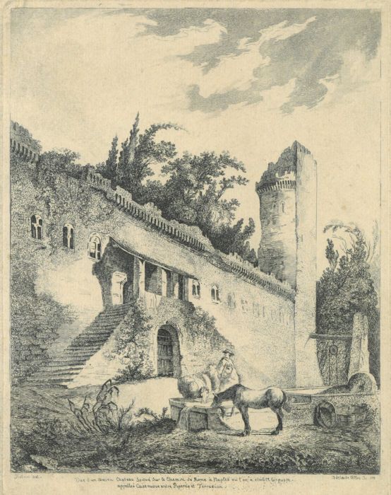 Vue d'un ancien chateau scitué sur le chemin de Rome à Naples. Ansicht einer Ruine mit Pferden und einem Reiter im Vordergrund.
