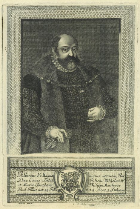 ALBRECHT V., Herzog von Bayern (1528 - 1579). - Hüftbild nach halbrechts mit Schaube und Ordenskette vom Goldenen Vlies, in der Rechten Handschuhe, darunter Wappen und Inschrift.