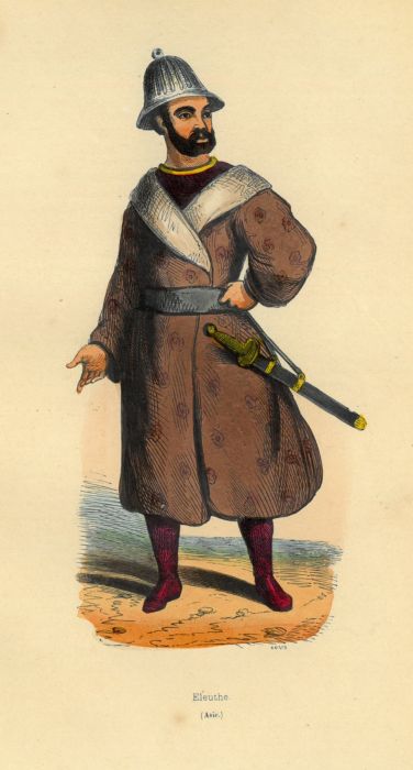 ALEUTEN. - Tracht. - Mann von den Aleuten, mit Mantel, Helm und Schwert.