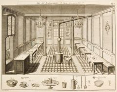 LIMONADE. - Art du Liquoriste. Blick in einen großen Arbeitsraum zur Herstellung von Limonade. Seitlich Arbeitsplätze, in der Mitte ein Ofen. Unter der Darstellung detaillierte Abbildungen einzelner Arbeitsgeräte.