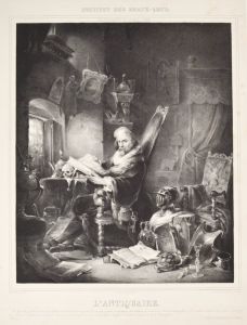 KUNSTHANDEL. - Antiquitäten. - L'Antiquaire. Der Antiquitätenhändler sitzt in seiner Stube, umgeben von seinen Schätzen, darunter ein Totenkopf, Globus, Teile einer Ritterrüstung, Bilder und Bücher.