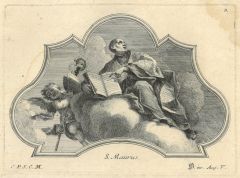 MAURUS. - S. Maurus. Der Heilige Maurus von Subiaco in Ganzfigur nach rechts auf einer Wolke sitzend verweist auf eine Stelle in einem aufgeschlagenen Buch. Links neben ihm hält ein Putto seine Mitra und den Krummstab. Mit geschwungener