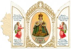 PRAG. - Gnadenbild Jesulein. - Klappbild. - Dies Bildchen klein will ich Dir schenken als liebes an mich Angedenken. Aufklappbares Triptychon. Mittig das Jesuskindlein, seitlich weisende Engel, aufgeklebt auf geprägtes, gekreidetes Papie