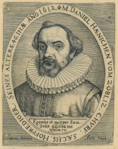 LORENZ STRAUCH (1554 - 1630). - M. Daniel Haenichen vom Zöbliz. Brustbild nach halblinks im Schriftoval des Pastors in Zoeblitz im Erzgebirge, unten Devise.