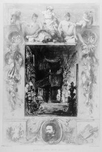 MAKART, Hans (1840 - 1884). - Makart und sein Atelier. Kleines Brustbild nach dreiviertellinks des Maler im Oval, darüber Blick in Atelier, umgeben von Allegorien, makartschen Frauenakten usw.