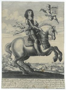 GASSION, Jean Comte de (1609 - 1647). - Ganzfigur nach halbrechts zu Pferde des Marschalls von Frankreich, in Rüstung mit Feldbinde, im Hintergrund Scharmützel vor Stadtsilhouette, rechts oben das Wappen.