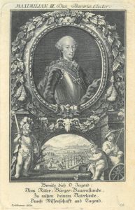 MAXIMILIAN III. Joseph, Kurfürst von Bayern (1727 - 1777). - Brustbild nach halbrechts im Oval, mit Brustpanzer und Orden vom Goldenen Vlies, unten eine Ernteszene, sowie drei Putten und eine Inschrift.