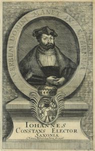 Der Kurfürst hatte maßgeblichen Anteil an der Augsburger Confession 1530. - Mit Rändchen um die Einfassungslinie, unten rechts kleiner minimaler Ausriß. (Artikelnr. 4723EG)