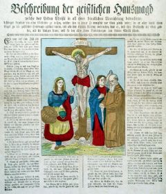 BILDERBOGEN. - Christenlehre. - Hausmagd. - Beschreibung der geistlichen Hausmagd, welche das Leiden Christi in all ihrer häuslichen Verrichtung betrachtete usw. Ganzfigur einer Magd, links stehend unter einem großen Kruzifix, rechts f?