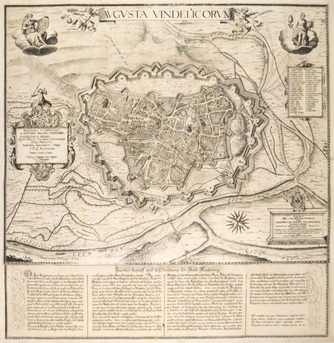 Schefold 40156. - Links im Bild Wappenkartusche mit Widmung an J.J. Stenglin und Ludwig Rein, rechts oben "Verzeichnis etlicher Örter" von 1 - 45 und rechts unten Widmung an Gustav Adolph. Am unten Rand "Kurtzer Begriff und Beschreibung der Statt Augspurg". - Sehr seltene, große Vogelschauansicht in tadelloser Erhaltung.