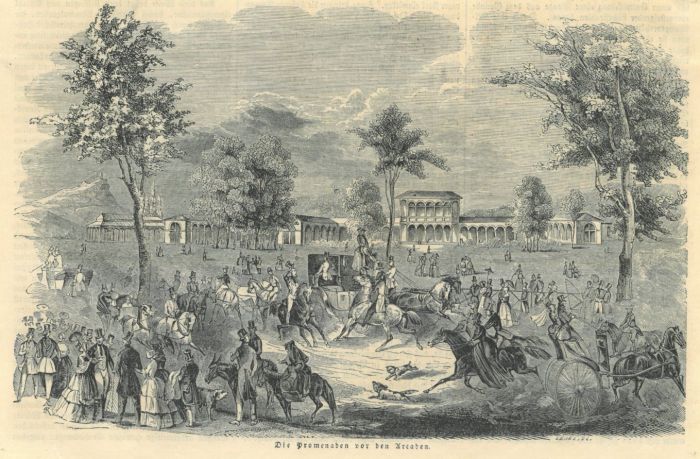 Die Promenade vor den Arcaden, im Vordergrund lebhafte Staffage mit Kutschen, Reiter und Spaziergängern.