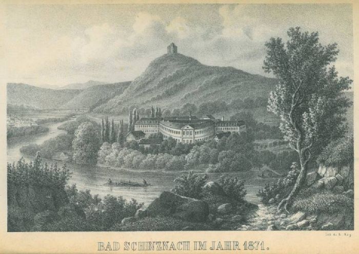 Über Geschichte, Lage und Klima der Gegend, das Spital in Schinznach, die umliegenden Orte und die geologischen Verhältnisse des Bodens und der Quelle. Der medizinische Teil behandelt die physiologischen und therapeutischen Wirkungen der Schwefeltherme, führt die Krankheiten auf, die in Schinznach geheilt werden können oder für die die dortigen Kuranwendungen schädlich sind. Mit einer Anleitung für die Anwendung des Mineral-, Jod- und Bromwassers in Schinzach und Wildegg. - Mit einer kleinen Bibliographie über Bad Schinznach. - Die Ansichten zeigen das Bad in den Jahren 1663 (2), 1708 und 1871. - Mehrfach gestempelt, Vorderdeckel mit Resten eines alten Schildes.
