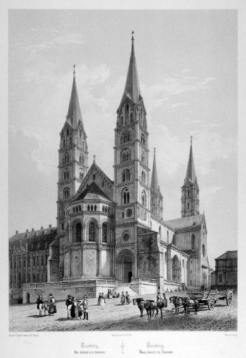 Bamberg, Haupt Ansicht der Domkirche. Frontansicht, im Vordergrund mehrere Personengruppen und vierspänniger Leiterwagen.