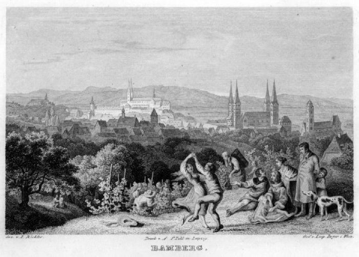 BAMBERG. - Gesamtansicht von der Ludwigshöhe aus, im Vordergrund die Weinernte im Süssen Grund.