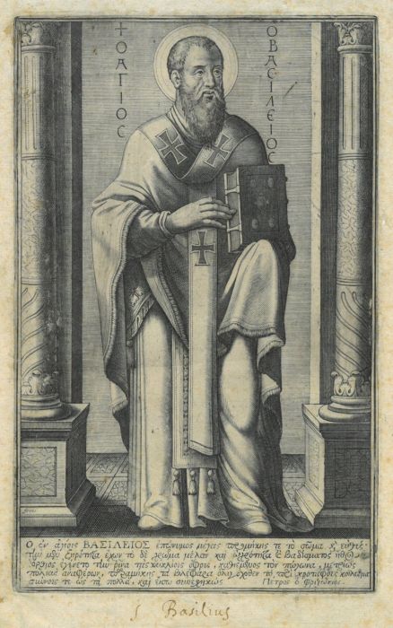 BASILIUS der Große. - Ganzfigur nach halbrechts des Verfassers zweier griechisch- orthodoxer Klosterregeln, stehend zwischen Säulen im Bischofsgewand mit Buch, unten Inschrift in Griechisch von Petros o Phrizonios.