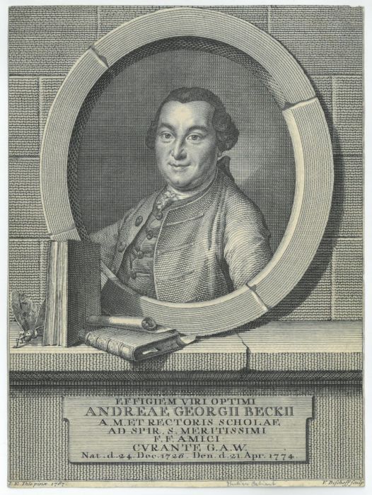 BECK, Andreas Georg (1726 - 1774). - Brustbild nach halblinks im Oval des Philologen, Pädagogen und Rektors der Hl.-Geist-Schule in Nürnberg, darunter Bücher und Inschrift.
