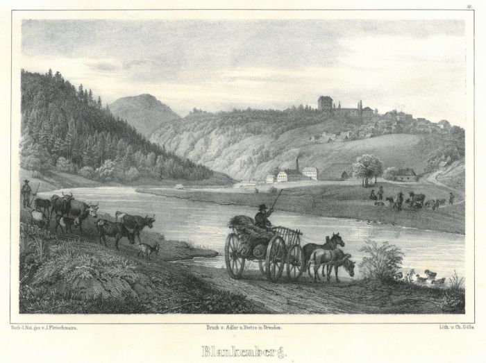 Blankenberg. Ort mit Schloß, die Saale im Vordergrund.