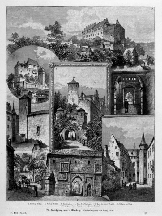 Die Kadolzburg unweit Nürnberg. 8 Ansichten auf einem Blatt (u.a. nördliche und westliche Ansicht, innerer Burghof, Burgeingang).