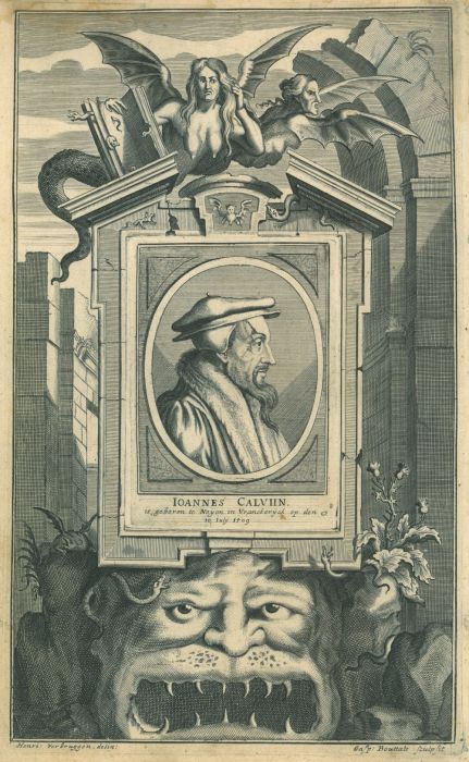 CALVIN, Johannes (1509 - 1564). - Brustbild im Profil nach rechts im Oval des Reformators, als gerahmtes Bild vor der Ruine eines Kirchenportals, unten ein Ungeheuer mit aufgerissenem Maul, oben zwei Harpyen mit wurmzerfressenem Buch.