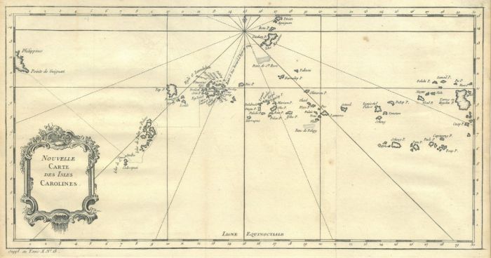 Nouvelle Carte des Isles Carolines. Schöne Karte der Inselgruppe, links ein kleiner Teil der Philippinen.