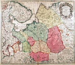 Koeman, Atlantes Neerlandici, Bd. II, S. 105 f. El 2. - Die flächenkolorierte Karte zeigt das Gebiet nördlich von Moskau mit dem Ladoga-See, Onega-See, die Halbinsel Kola und dem ... (Artikelnr. 18020BG)