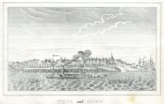 Die panoramaartige Ansicht zeigt links die Alte und rechts die Neue Stadt. Rechts unten kleines Wappenschild mit Erklärungen A - V. (Artikelnr. 28047CG)