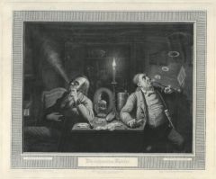 SPIELE. - Kartenspieler. - Die entzweiten Spieler. Zwei Kartenspieler rauchend an einem Tisch, sitzen voneinander weggedreht. Die Stube mit einem Ofen und Bildern an der Wand, auf dem Tisch eine Kerze, Karten und zwei Krüge.