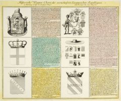 EUROPA. - Wappen. - Historische Wappen-Charte der vornehmsten Europaeischen Republiquen. Tafel insgesamt 6 Wappen, jeweils mit Erklärung.