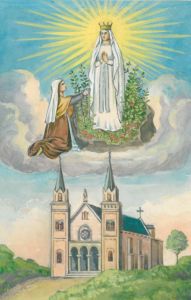 KLEINENBERG. - Wallfahrt. - Blick auf die Wallfahrtkirche "Mariä Heimsuchung", darüber das Gnadenbild "Auxiliatrix de Monte Modico" im Strahlenkranz, schwebend auf Wolken.