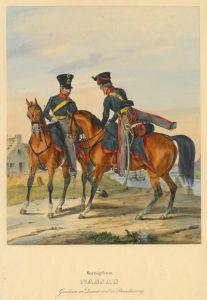 MILITARIA. - Preußen. - Gendarmerie. - Königreich Preussen. Corps Gendarmerie. Unteroffizier. Berittener Unteroffiziere hält für zwei Offiziere deren Pferde am Zügel.