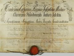 Handschrift auf gefaltetem Pergament mit Kordel angehängtem Wachssiegel in einer Messingkapsel, Wien 1778, 45 x 66 cm (Blattgröße); 7 cm (Kapseldurchmesser).