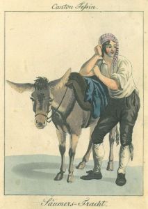 TESSIN. - Tracht. - Säumers-Tracht mit der eigentümlichen rot-blau gestreiften Zipfelhaube.