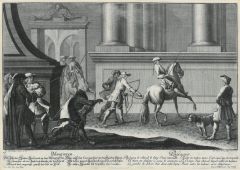 PFERDE. - Reitschule. - Ausschlagen. Das ausschlagende Pferd ist an zwei Säulen angebunden und wird gepeitscht. Rechts und links Zuschauer, Reiter und ein Hund.
