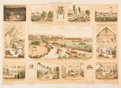 Altkol. Lithographie auf bräunlichem Papier bei G. Kühn, Neuruppin, um 1850, 6,5 x 12 cm (Einzelansicht); 32 x 40 cm (Blattgröße).