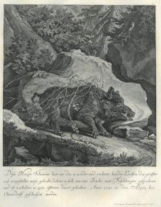 JAGD. - Wildschwein. - Dises Haupt Schwein ... ist Anno 1731 in dem Algeu bey Oberndorff geschossen worden, es lehn an einem Felsen und ist von Dornengestrüpp umgeben.