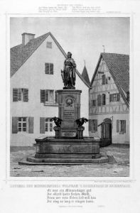FÜRSTENFELDBRUCK. - Das Denkmal vom Kaiser Ludwig dem Baier beim Dorfe Puch in der Nähe von Fürstenfeld im Königreich Baiern. In der Bildmitte das Denkmal, rechts Bauernhäuser und die Pfarrkirche von Fürstenfeldbruck.