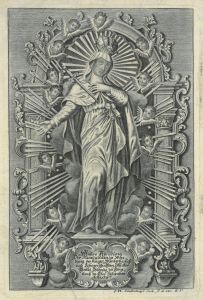 MARIA. - Trösterin der Betrübten. - Kniestück nach halblinks Mariens, das Kind mit Gürtel in der Rechten auf dem Schoß, oben "Consolatrix Afflictorum", unten Rocaillen und Psalmvers.