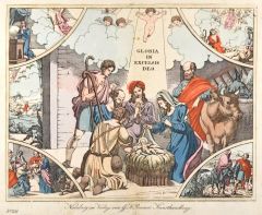 Bis zur Einfassungslinie beschnitten, alt montiert auf blaues Bütten mit lithographierter Umrandung, verso aufgeklebt eine von der Darstellung unten abgetrennte Devis... (Artikelnr. 13699EG)