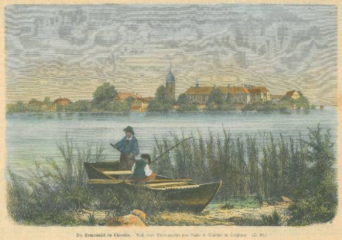 Blick über den See auf die Fraueninsel, vorne am Ufer zwei Angler im Boot.