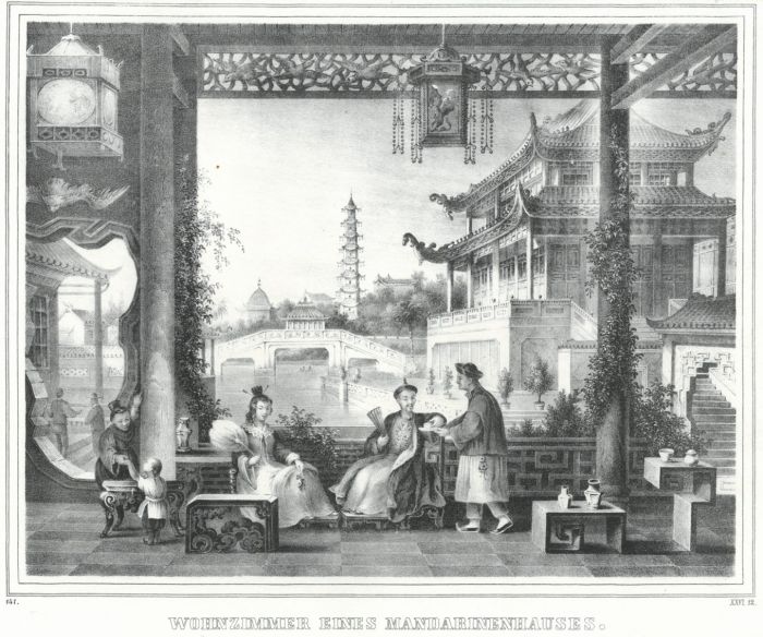 Wohnzimmer eines Mandarinenhauses. Mandarin mit Frau, Kind, Diener und Dienerin in seinem Wohnzimmer mit Ausblick auf einen Palast sowie einen See mit Brücke und Pagode.