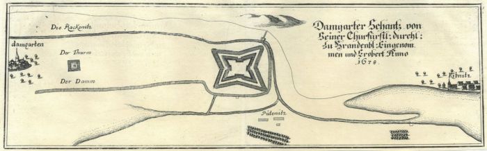 DAMGARTEN. - Damgarter Schantz von Seiner Churfürstl: durchl: zu Brandenbl: Eingenommen und Erobert Anno 1678. Befestigungsplan mit Ansicht von Ribnitz.