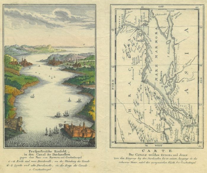 DARDANELLEN. - Perspectivische Einsicht in den Canal der Dardanellen (13,5 x 9 cm), daneben "Carte Des Canals zwischen Europa und Asien" (13,5 x 9 cm). Zwei Motive nebeneinander.