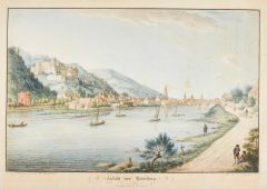 HEIDELBERG. - Ansicht von Heidelberg. Gesamtansicht über den Neckar, auf dem Fluß mehrere Boote und Kähne, am Ufer ländliche Staffage.