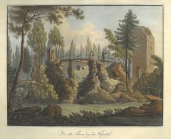 HOHENHEIM/bei Stuttgart. - Der alte Thurm bey dem Wasserfall. Blick auf den Turm mit Holzbrücke, darauf Spaziergänger.