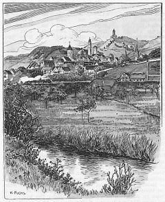HORNBERG/Schwarzwald. - Gesamtansicht, rechts auf einem Berg das Schloß, links im Tal der Ort mit der Johannes-Täufer-Kirche.