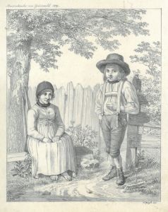 GÖGGINGEN. - Tracht. - Baierische Volkstrachten. aus dem Landgericht Göggingen. Junges Bauernpaar in der typischen Tracht im Gespräch an einen Zaun gelehnt.