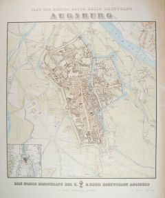 AUGSBURG. - Plan. - Plan der koenigl. bayer. Kreis-Hauptstadt Augsburg. Stadtplan mit zwei kleinen Nebenkarten (Umgebung von Augsburg und Erzbergerisches Gut).