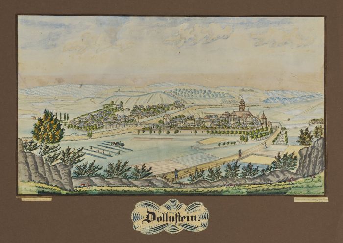 Der nicht weiter bekannte Maximilian von Asten zeichnete mit einem besonderen Augenmerk auf die Architektur Die umliegenden Felder und Berge sind eher in skizzenhafter Manier ausgeführt. - Titel ausgeschnitten und aufmontiert. Nur leicht gebräunt, links im Himmel gering fleckig.