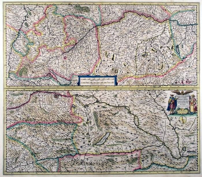 Karte des Donaulaufs in zwei Teilen übereinander bis Belgrad. Unterer Teil mit figürlicher Titelkartusche, oberer Teil mittig mit Meilenzeiger